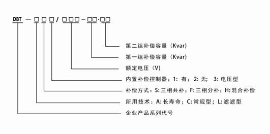 如:DBT-CS1/450-20.10,表示常規(guī)型,內(nèi)置補償控制器,三相共補,第一組電容為20kvar; 第二組無功輸出均為10kvar,總?cè)萘繛?0kvar的智能型電容器。