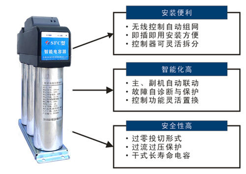 SFC型智能電容器則把無(wú)功補(bǔ)償控制器、投切開(kāi)關(guān)、電容器、斷路器等集成為一體,采用無(wú)線控制,不需要控制接線;自動(dòng)識(shí)別電容器,不需要人工設(shè)置參數(shù);自動(dòng)組網(wǎng),即插既用,提高工作效率,減少材料損耗、降低生產(chǎn)成本,完全替代傳統(tǒng)無(wú)功補(bǔ)償系統(tǒng)。參數(shù)后系統(tǒng)才能正常投運(yùn)。